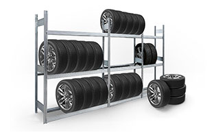 - Reifenregale: Sichere Lagerung von Reifen und Felgen aller Art, sorgt für Ordnung und Übersichtlichkeit in Ihrer Werkstatt oder Ihrem Lager. Die Stufenbalken der Reifenregale haben eine speziell angepasste schräge Abkantung, damit Reifen und vor allem Felgen schadlos gelagert werden können.