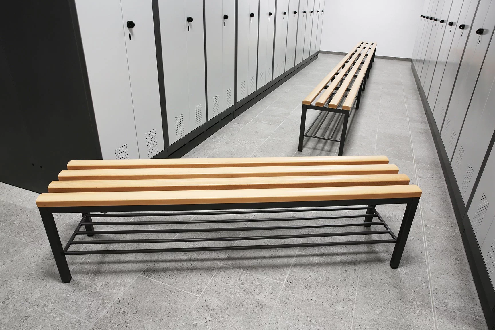 Sitzbänke und Unterbausitzbänke bieten erhöhten Komfort in Ihren Umkleideräumen. Die Wahl zwischen Fichtenholz- oder Kunststoffleisten sowie optionale Anpassungen wie höhenverstellbare Füße oder Schubladen ermöglichen eine individuelle Gestaltung. Insbesondere bei Vereinssport oder in Unternehmen mit Schichtbetrieb, bei denen eine größere Personengruppe gleichzeitig die Spinde zum Umziehen nutzen, sind Sitzbänke enorm praktisch und erleichtern das Handling von Taschen, Schuhen und anderen Gegenständen.