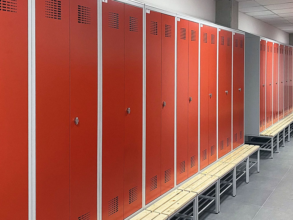 Neben dem Verkauf von einzelnen Spinden steht BERGER auch für die Umsetzung großer Projekte, bei denen ganze Umkleideräume mit langen Spind-Reihen ausgestattet werden.