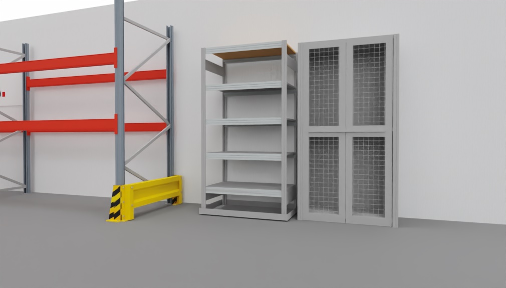 Das BERT Fachbodenregal ist so vielseitig konfigurierbar, wie die Anforderungen der unterschiedlichen Branchen. Hier sehen wir ein gängiges Regal mit 2 Meter Höhe und möglichen Fachlasten bis 150 kg. Linksseitig flankiert wird das Fachbodenregal von einem ARTUS Palettenregal, dessen Rahmen durch einen massiven Rammschutz abgesichert ist. Rammschutz bietet BERGER in vielen Varianten, damit Ecken von Regalen oder Gebäudeteilen genauso geschützt werden können, wie ganze Regalseiten und auch Regal-Mittelstützen. Der hier gezeigte Eck-Rammschutz wird inklusive vier Bolzenanker geliefert.